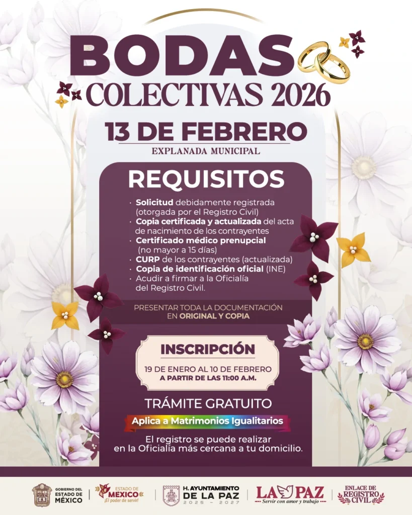 Saludos. El H. Ayuntamiento de La Paz informa sobre el registro a las Bodas Colectivas a realizarse en Febrero 2026,