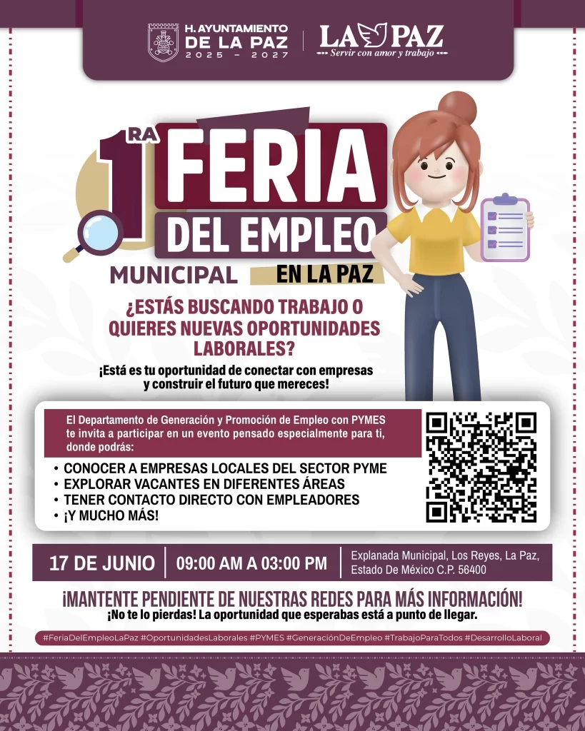 Recuerda que el próximo 17 de Junio se llevará a cabo la Feria de Empleo en La Paz, la cita es en la explanada municipal en un horario de 9 a 3pm, es un evento organizado por la Secretaría del Trabajo y Previsión social en coordinación con el H. Ayuntamiento.