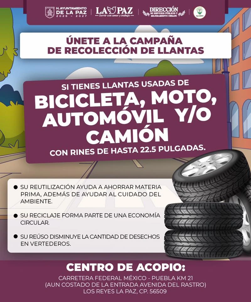 Gobierno de La Paz invita a donar llantas de desecho en su centro de acopio
